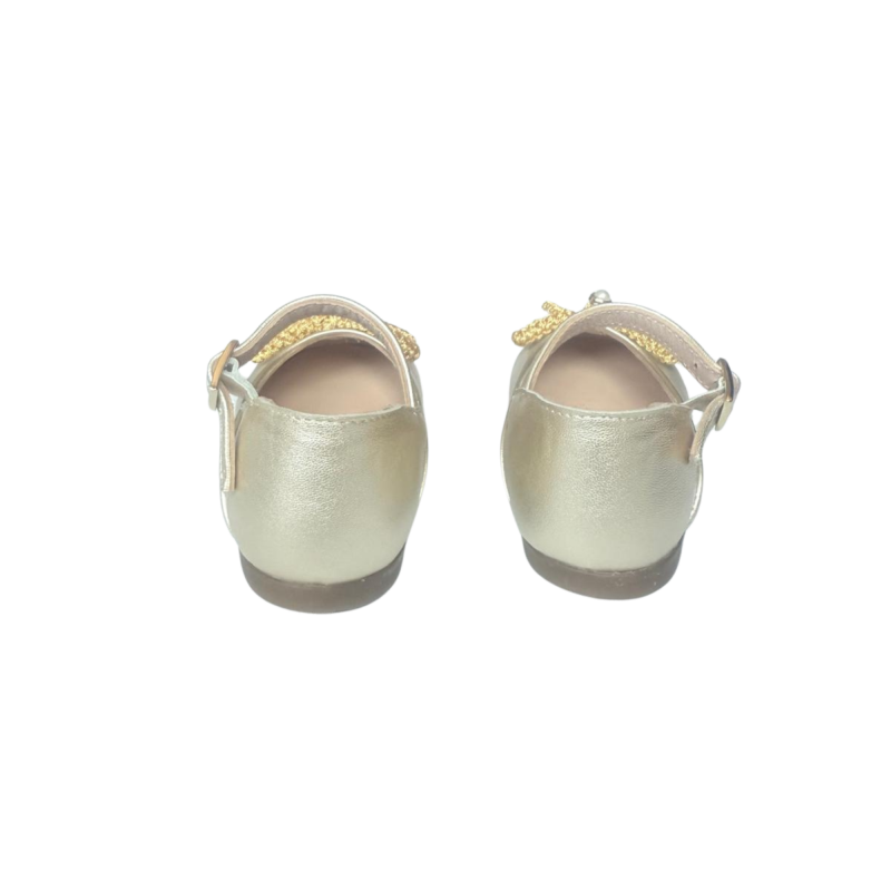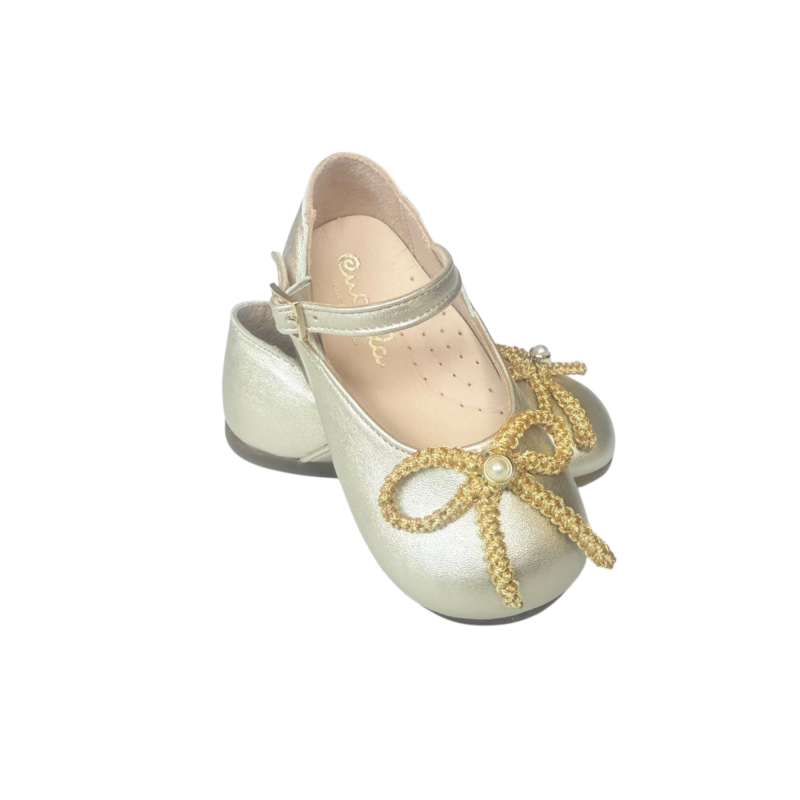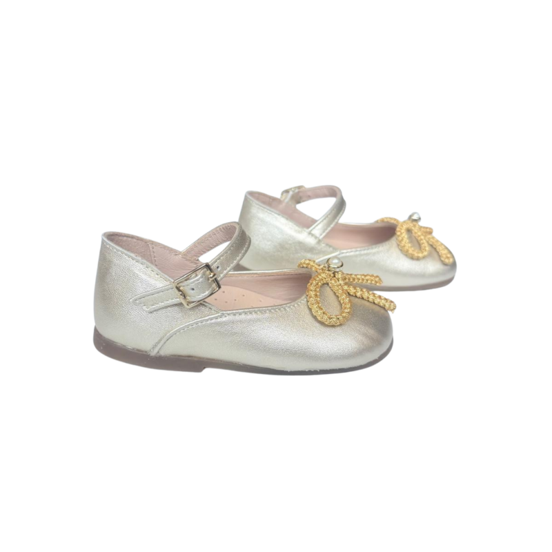 De sierlijke strik op de neus, afgewerkt met een subtiel pareldetail, geeft deze schoen een klassieke en charmante uitstraling. Het fijne bandje met gesp zorgt ervoor dat de ballerina mooi op zijn plaats blijft.