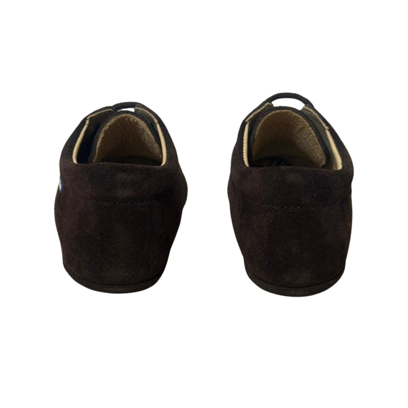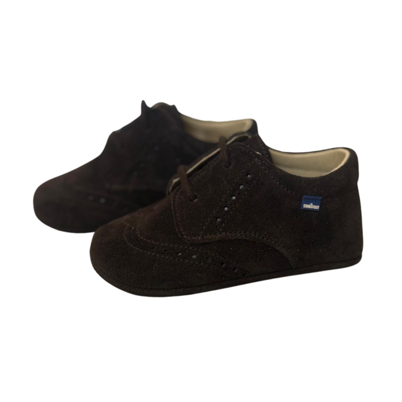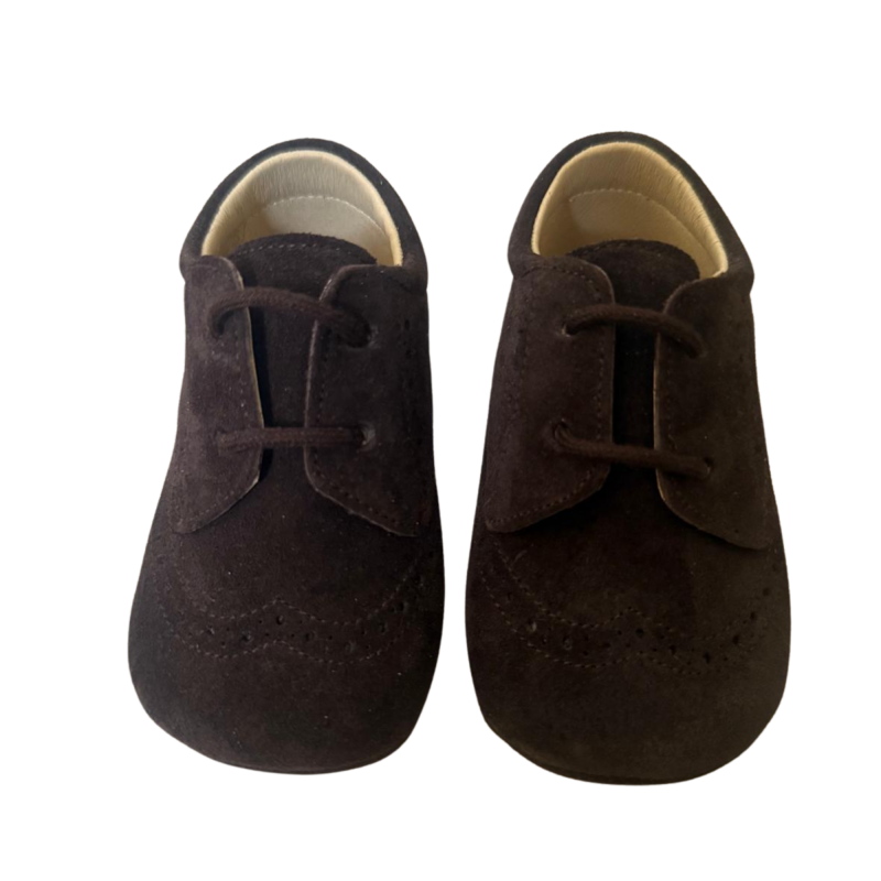 Een klassieke eerste stapschoen, uitgevoerd in rijk bruin suède met een verfijnde afwerking.