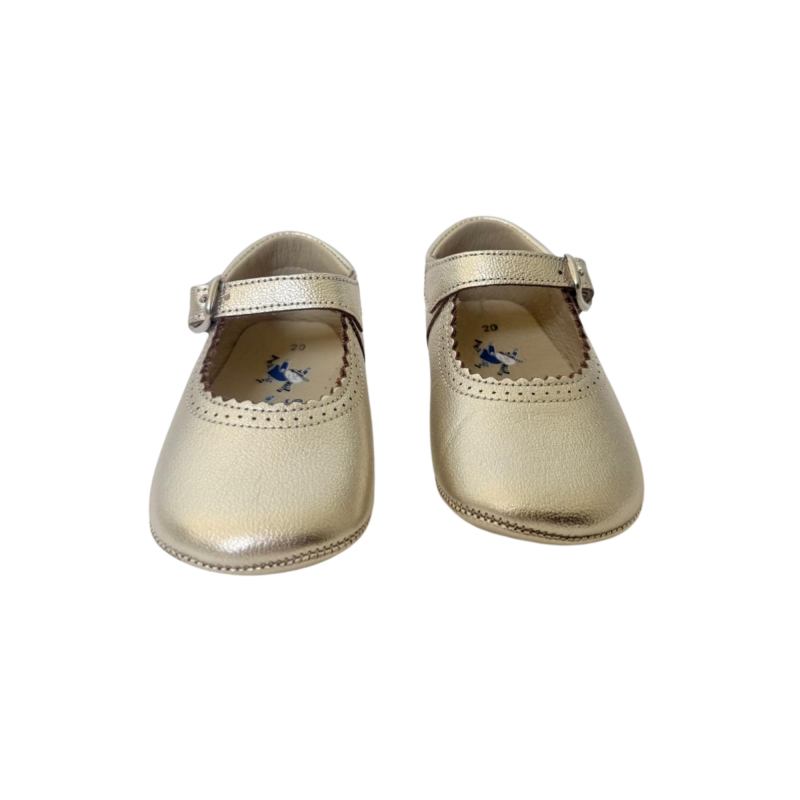Een verfijnde eerste ballerina in een zachte goudtint, met een subtiele glans en een elegante uitstraling.